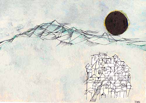 「水が悪いんだ」お腹でもこわしたの?「いや、頭を洗ったら、髪の毛が抜けるんだ。毒がまざっているのかなあ」モーグル君は頭を見せてくれ る。円形脱毛症だ!「それは、ストレスだよ」と教えてあげる。「病院に行かなくても治るの?」ああ大丈夫だ。